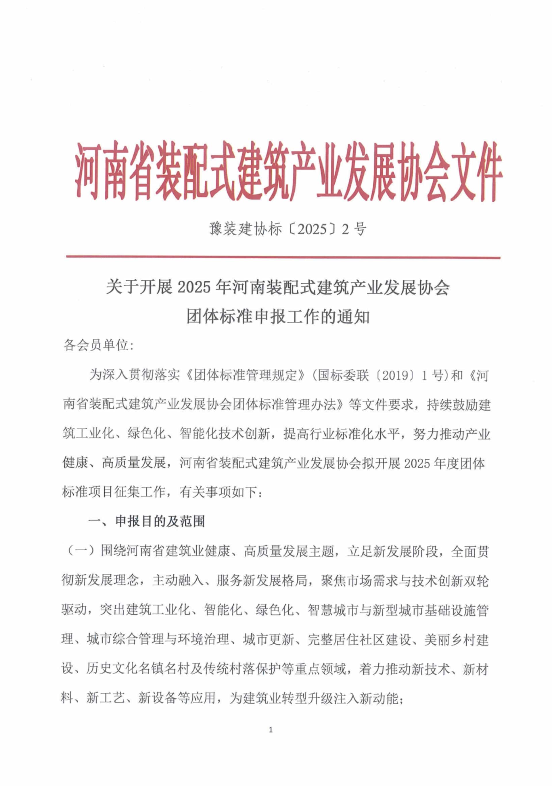 关于开展2025年河南装配式建筑产业发展协会团体标准申报工作的通知